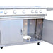 The freestanding grill cart is constructed from 304 stainless steel and includes two side shelves, a double-door storage cabinet, and an integrated propane tank holder. Locking caster wheels ensure mobility and stability, while ventilation louvers enhance safety by preventing gas buildup.