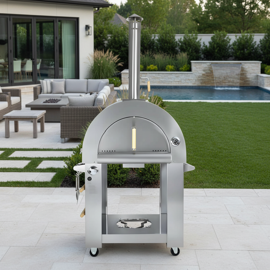 A four-piece stainless-steel pizza accessory kit—including a peel, cutter, server, and brush—comes standard for complete cooking functionality.