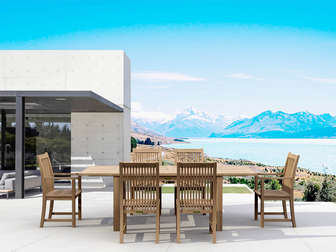 This solid Teak “Rectangular Extension Table” makes the perfect addition to your backyard. Our extension table begins as a 59-inch long rectangular and easily extends with detachable leaves to a 95-inch long rectangular in less than 15 seconds. The table can be extend with 1 or 2 leaves, seats 6 to 10 people. Available with umbrella hole. The table is combining with 2 Chicago Armchairs and 4 Chicago Chairs. Both chairs have traditional curved seat and back makes the chair comfortable when sit on it. Add all-weather cushions from Sunbrella for extra comfort. Place this dining table set in your backyard which will amazed your family and friends.