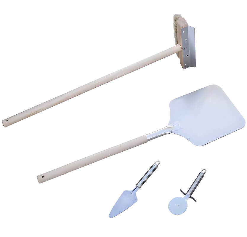 A four-piece accessory kit is included, featuring a pizza peel, pizza cutter, pizza server, and stainless-steel brush for complete functionality.