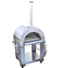 The oven includes a removable stainless-steel cart, offering flexible installation as a portable freestanding unit or built-in configuration. The cart includes wood storage, tool hooks, a side rack, and four caster wheels (two locking) for mobility and stability.